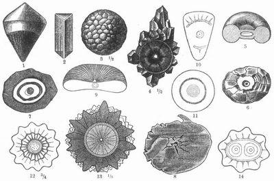 Hagel ist ein fester atmosphärischer Niederschlag, der in sehr wechselnder Gestalt auftritt. Am häufigsten besitzt er die Form einer Kugel (Fig. 3) oder eines Kugelsektors, d.h. einer Pyramide mit kugeliger Grundfläche (Fig. 1). In beiden Fällen ist in der Kugelmitte ein schneeiger Kern, um den sich abwechselnd klare durchsichtige und undurchsichtige Schichten legen (Fig. 7, 11 & 12). Der Kern besteht aus zusammengeballten Schneekristallen wie die Graupeln. Außen setzen sich oft noch Kristalle oder kristallähnliche Gebilde an, so dass die Hagelkörner dann ein stacheliges Äußeres zeigen (Fig. 4, 12 & 13). Bisweilen fallen kristallinische Formen (Fig. 2) oder Kombinationen mehrerer Kristallformen (Prismen, Rhomboeder etc.) sowie klare Eisplatten. Häufig sind die Hagelkörner von Pfirsichgestalt; andre stellen flache Rotationskörper mit verdicktem Rande dar (Fig. 9). Nicht selten sind auch radförmige Hagelstücke, bei denen sich um eine klare Scheibe ein ringförmiger Wulst legt (Fig. 5). Die Größe der Hagelkörner ist sehr verschieden, von Erbsen- bis Hühnereigröße und darüber. Unter den kleineren werden solche wie Fig. 1 besonders oft beobachtet, unter den größeren herrscht die Kugelform vor. Da die Hagelkörner nach dem Fallen leicht zusammenbacken und große Eisklumpen bilden, so sind Nachrichten über besonders große Hagelstücke mit Vorsicht aufzunehmen, doch sind solche von der Größe einer Orange und selbst Kegelkugel im Alpengebiet schon beobachtet worden.